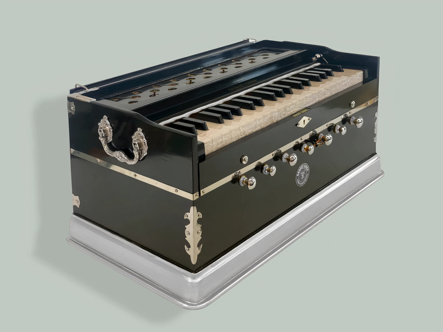 Deze Harmonium is op traditionele wijze met de hand gemaakt door ervaren en toegewijde vakmensen. Het instrument is gemaakt van gekruid seesham hout van d beste kwaliteit, dat wordt gebruikt voor het maken van muziekinstrumenten. De balg is gemaakt van gelamineerd dun hout terwijl de Franse polish, Wood colour sealer en lak een elegante uitstraling geven. Handgemaakte koperen rieten zijn bevestigd op het rietbord in de binnenkamer van het Harmonium. Toetsen zijn bedekt met nylon materiaal voor soepel spelen. Het harmonium is verkrijgbaar in verschillende maten en stemmen (enkele of dubbele balg).